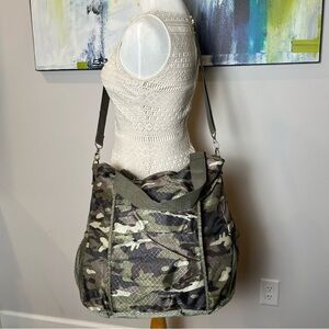 Stylish camouflage tote bag perfect for everyday use. Features a durable design with a comfortable strap. Zip top closure with multiple pockets, including a bottom compartment for your shoes. Excellent bag for travel or the gym.