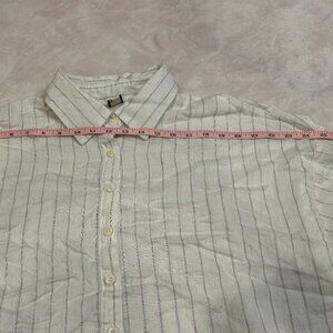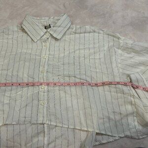 The product is a women's clothing set from 31 fashion, featuring a cream ivory striped linen button-up shirt with long sleeves and a cropped style. The size is small, making it a versatile and stylish addition to any wardrobe for those looking for a trendy and comfortable top option.