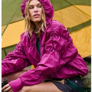 Super lightweight and ready for the elements, this pullover style jacket is a must-have on your next hike. Featuring a breathable, grid-like nylon fabrication with a wind- and water-resistant finish, and a sweat-wicking mesh lining and adjustable ventilation to keep you cool on the move. Relaxed fit; pullover style; hits right below waist, Lightweight, underarm and back body ventilation; hood rolls down and secures in place; zippered hand pockets; large back storage pocket with separate storage compartments; draw cord adjustable hood; adjustable bottom hem; packable hood; ribbed cuff detail. Ruched femme detail meets trail-ready tech for your next hike.