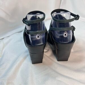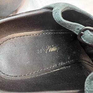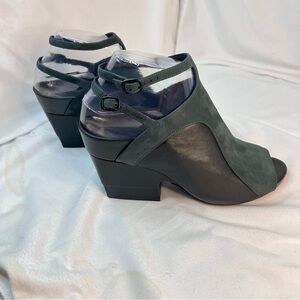 These elegant heels from 3.1 Phillip Lim feature a striking gray and black color combination, perfect for adding a pop of sophistication to any outfit. The open-toe design and sleek silhouette make them a versatile choice for both casual and formal occasions. With a comfortable block heel, these shoes offer both style and support. Featuring black leather and grey nubuck uppers in a mule-inspired style and kept secured by two straps around your ankles. The 3 3/4 inch chunky heel adds the perfect amount of height.