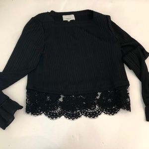 Long-Sleeve Rib-Knit Cropped Top W/ Lace, Black