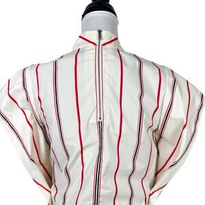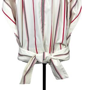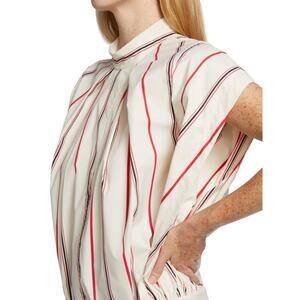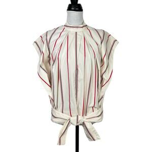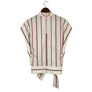 3.1 PHILLIP LIM | Ivory Red Striped Stand Collar Cap Sleeve Tie Hem Designer Top