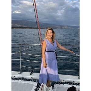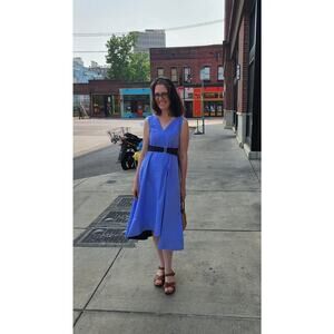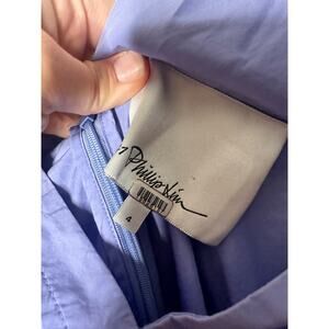 3.1 PHILLIP LIM Purple A-Line Sleeveless V-Neck Poplin Belted Midi Dress in size 4 is a modern and sophisticated piece that seamlessly blends elegance with comfort. Made from crisp poplin fabric, this dress features a rich purple hue that makes a bold yet refined statement. The sleeveless design and deep V-neckline create a sleek, flattering silhouette, while the adjustable belt cinches the waist to highlight your figure. The A-line skirt falls to a midi length, offering a versatile and timeless style. Perfect for daytime events or dinner outings, pair it with heels or sandals for a polished, chic ensemble.