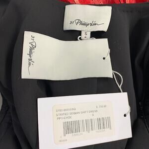 3.1 PHILLIP LIM dress in a black silk featuring a tank style, all over sequined red and burgundy stripe design, and pullover closure.