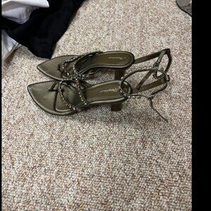 Verona sandal with crystal embellishment. Thong strap. Pointed toe and a mid block heel. Slim buckled ankle strap.