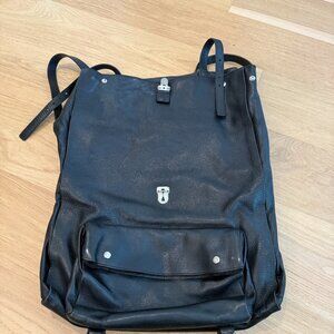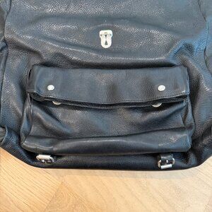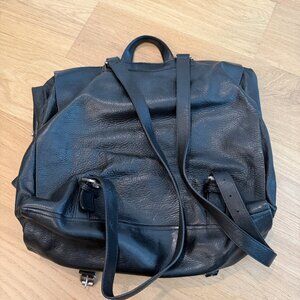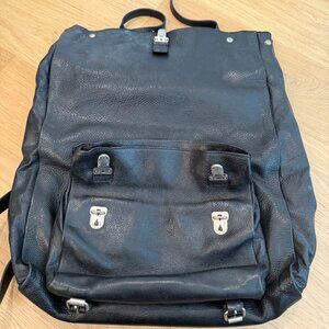 3.1 Philip Lim full black leather backpack in good condition. It does have a broken snap on the top left side of the backpack but does not affect the functionality. The backpack measures approximately 18" wide x 18" tall (when closed) and 5" wide. The total height of the backpack is 23". There is one front compartment and one interior zip pocket. There are two straps on the front to securely close the backpack but totally fine just using the buckle snap.