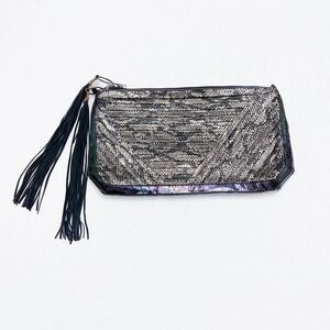 A luxurious leather pouch with assymetrically woven snakeskin print finished with a dark iridescent leather trim