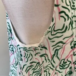 Sleeveless dress in Scribbled Trees print crepe. A-line silhouette with a v-neck. Flared asymmetrical hemline with contrast panel and dipped back hemline.