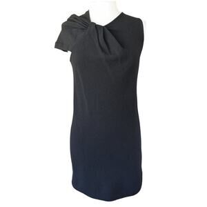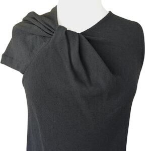 Black wool-crepe shift dress with twisted pleat shoulder and has one cap sleeve, one sleeveless.
