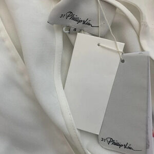 Brand new (with defects) 3.1 Phillip Lim White Blouse. Features a v-neckline and long sleeves. Sleeves are flared and pleated with a button closure. Features pintuck detailing at waist. Waisted. Keyhole back with button closure and tie at back. Lined. Hidden side zip.
