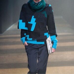 Stunning patchwork sweater with teal fuzzy patch on top, knitted navy, sheer knit black and then blue knit on bottom. Oversized fit. One very small pull in black portion as pictured. Not noticeable. Size small. About 18.75 inches from pit to pit laying flat. About 25.5 inches long. Excellent condition.