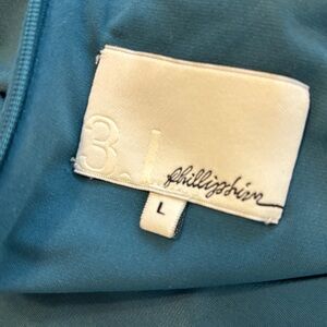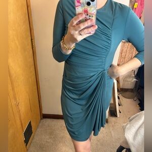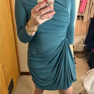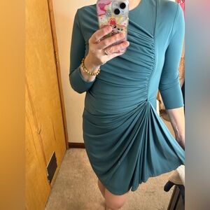 Excellent pre worn condition 3.1 Phillips Lim dusty green long sleeve ruched front dress with draped pleated skirt detail. Figure flattering and elegant style. Night out, wedding, event, party, socializing. (X)