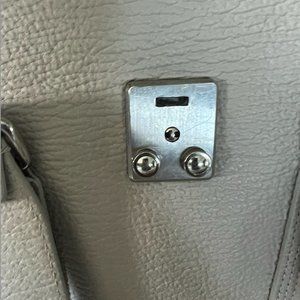 3.1 Phillip Lim Large Pashli Satchel, in light gray leather, two rounded top handles with 4”drop, silver tone hardware, inside zipper pocket, two front sides zipper that makes bag go from 13”wide to 16”, crossbody handle with adjustable strap from 18”-24” drop. Great work bag