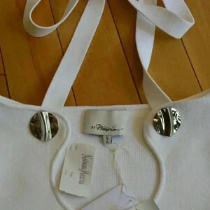 Long sleeve jersey pullover with a scoop neckline and hammered metal embellishments. Tie closure at the back.