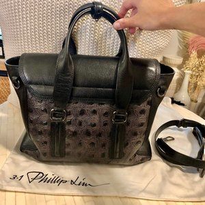 The classic 3.1 Phillip Lim Pashli satchel, rendered in rich, turtle-embossed leather. A button-tab secures the rolled leather handles, and the adjustable shoulder strap is removable. Brushed, gunmetal-tone hardware. A push lock opens to the lined, 1-pocket interior. Dust bag included. Almost perfect condition!