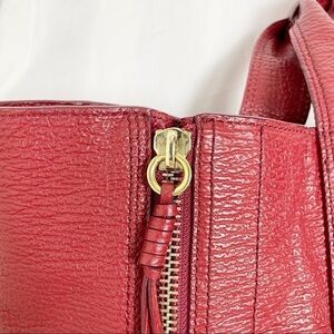 Textured grained calfskin leather, expandable side zip panels, gold hardware, topstitching, open top, satin lined. Red.