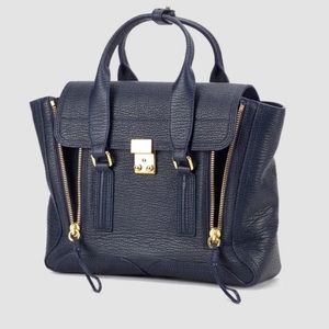 Gorgeous 3.1 Phillip Lim Pashli satchel in the color ink (navy blue). This is the medium size with gold hardware. Zippers on the front of the bag can be pulled up or down for a more compact look or to provide a little more interior space. You can really fit a lot into this bag. It is in very good to excellent condition. Some minor scratches on the locking mechanism and one corner has a small amount of wear as shown (see photos 5 and 8). Otherwise the bag is in great shape. This type of leather is very sturdy and holds up well. Comes with removable strap and dustbag. Last two photos are for reference only but are the exact style and color for sale. Feel free to ask any additional questions. Smoke free home. Open to offers!