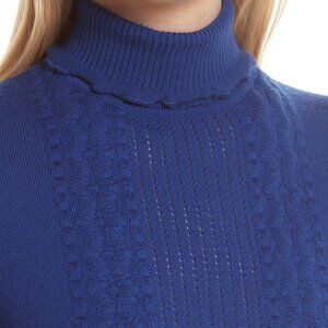 "Distinctive details like raised cabling, pointelle stitching and rolled ruffles make this fine-gauge, turtleneck pullover look delicately pretty."