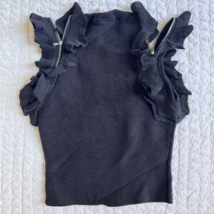 3.1 Phillip Lim ruffle knit tank with zip details and a crew neck. Sleeveless, slightly cropped length. Model photos shown in white color as a sample only. Color is black.