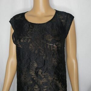 Rayon and silk(no material/interior tag but found this info on a listing elsewhere), semi sheer with beautiful pattern. Peekaboo/open back. Excellent condition.