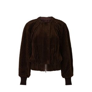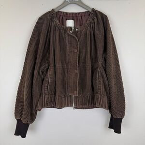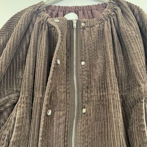 Brown corduroy (100% Cotton). Jacket. Long sleeves. Front zipper closure. 24" from shoulder to hemline.