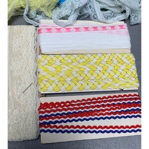 Various lace and trim styles for sewing and crafts, including ruffle lace, ric rac, and crochet trim. Ideal for enhancing projects with decorative accents.
