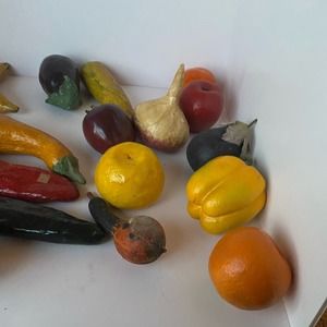 31 Pieces as I found 2 more that are not photo'd. Gently used. Please, see all photos for more details as they are part of my description. Comes from smoke and pet free studio. Some are kind of a paper Mache and some seem to be made of other ingredients. A few have damage. I tried to show the damage in the photos. Some are in great condition. Many unusual pieces such as egg plant, corn, onion, squash and peppers. The last 5 pictures show the damage. The pictures before that shows a tag.