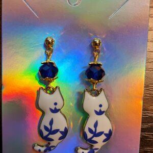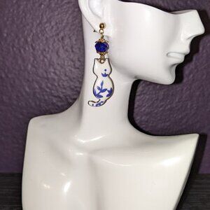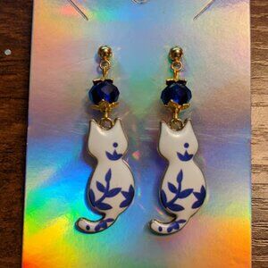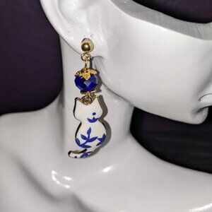 Cobalt blue and white floral enamel cat earrings with cobalt blue Czech glass and golden toned leaf accents. Super cute! Make them yours today!