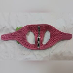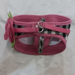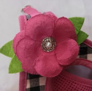 Adorable and well-made doggie vest / harness. Has double rings for leash and a beaded pink flower. Size small is adjustable with velcro. Clean, but not brand new. Take your fur baby out in style!