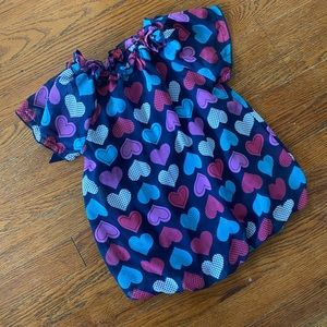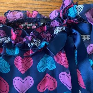 Flowy navy top with ruffles at top and navy satin bow. Printed with aqua and pink hearts.