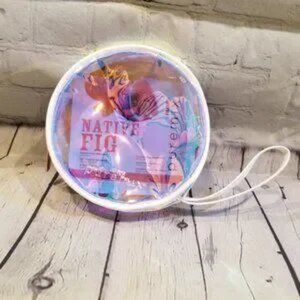 Circular clear/iridescent wristlet. White colored trim. Approximately 6" round.