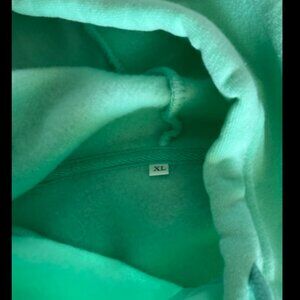 Really good con. Green lounge set in size XL. The top is hooded with a kangaroo pouch. Material 100% polyester. Bottoms have elastic waistband, pockets in the front, and tie. Super cute and stylish. Unsure of the brand. Open to offers:)
