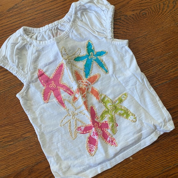 Great bright colors to this raised design, cute gathered cap sleeves, fantastic summer tee
