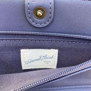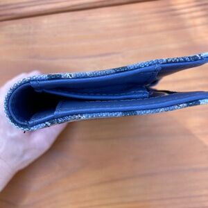 This is a lightly preowned wristlet wallet from Universal Thread. Canvas like material with faux leather inside in a southwestern design. Muted blue and gray colors. Strap is a brown color. Please look at measurements. There is only one small flaw that I can see. It looks like a little snag, see photo with arrow.