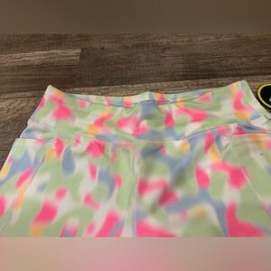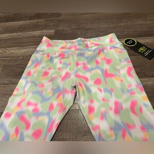 These leggings are so cute and comfortable. Never worn, one still has the tag. Special features include colorful designs, stretchy material, and pockets. One pair is a mix of blues, while the other has a mix of pink, green, orange, periwinkle, and white.