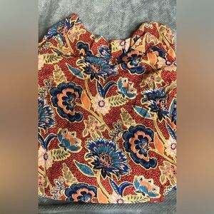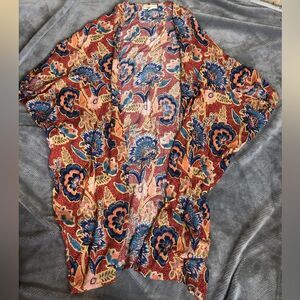 Vibrant floral kimono cardigan with a mix of red, blue, and cream colors. Perfect for layering.