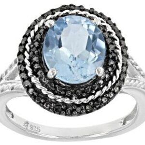 3.10ct Oval Sky BLUE TOPAZ w/ .01ctw Round Black Diamone Accent Rhodium over .925 Silver Ring
