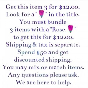 This item has a rose ๐น therefore you can get this item for 3/$12 BUT you must add 3 listings to a bundle. It doesn't have to be the same item. You can mix or match items especially if we have only 1 available as long as the title has a rose ๐น in it. If you don't add 3 items to a bundle you'll receive 1 item no ifs ands or buts.