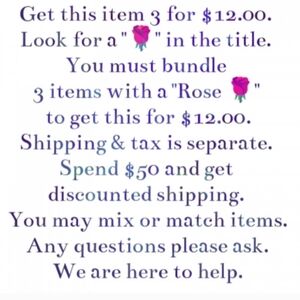 This item has a rose ๐น therefore you can get this item for 3/$12 BUT you must add 3 listings to a bundle. It doesn't have to be the same item. You can mix or match items especially if we have only 1 available as long as the title has a rose ๐น in it. If you don't add 3 items to a bundle you'll receive 1 item no ifs ands or buts.