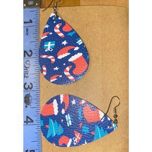 BRAND NEW!! Christmas Printed Double Sided Light Weight Faux Leather Tear Drop Style Dangle Earrings. About 2.2in” length, 1.5” in Width.