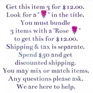 This item has a rose ๐น therefore you can get this item for 3/$12 BUT you must add 3 listings to a bundle. It doesn't have to be the same item. You can mix or match items especially if we have only 1 available as long as the title has a rose ๐น in it. If you don't add 3 items to a bundle you'll receive 1 item no ifs ands or buts.