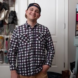 Used Red white blue and yellow button down shirt. Size L but fits like a M. Ment to be worn untucked.