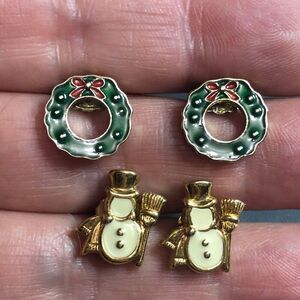 3130 AVON Vtg Goldtone lot of 2 christmas enamel earrings Mr. Snowman & Wreath