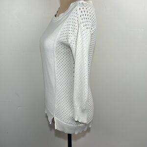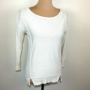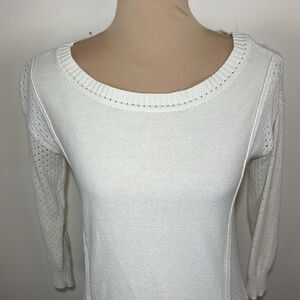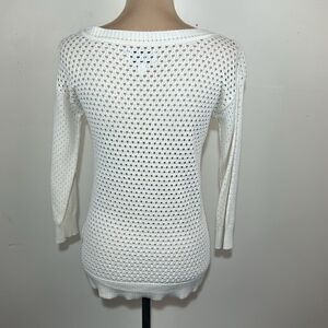 Good used condition other than some very small and not noticeable fuzz balls underneath the arms as shown in the pictures. American Eagle size extra small cream colored sweater. Three-quarter length sleeves