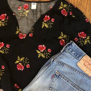 Whimsical and fun, this peasant top is casual and stylish. Buttons at cuff, meant to be loose fitting.