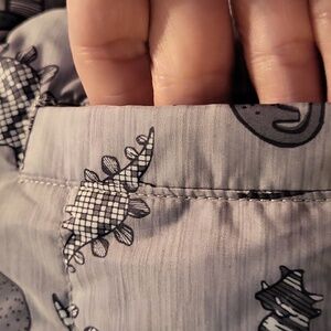 Cozy puffer jacket with a fun dinosaur print. Perfect for cold weather. Features a hood for extra warmth. Two front pockets, zip closure with cover tab at top.