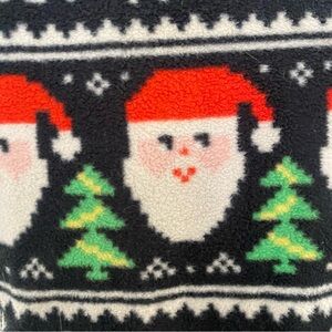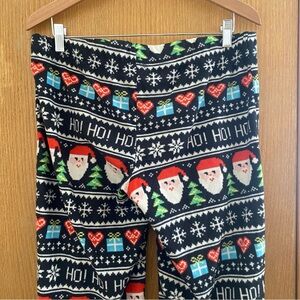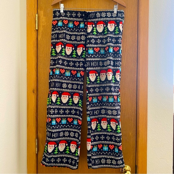 Fleece pajama bottoms for the holidays. Pants have patterns of Santa, Christmas trees, hearts, snowflakes, presents, and the words Ho Ho Ho. Preloved condition.