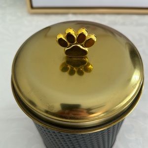 Super cute tin canister for your puppies treats. Black tin with gold puppy paw top with rubber seal to keep fresh. 7โ tall and 5.5โ across.