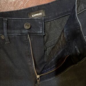 These Express dark blue skinny jeans offer a sleek and modern look with their tapered leg design. Crafted from a comfortable stretch denim blend, they provide a snug fit that moves with you. Perfect for any occasion, these jeans are a wardrobe staple.