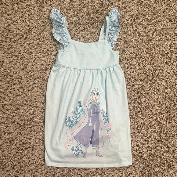 Charming light blue dress featuring a character print. Ruffled sleeves add a playful touch.
